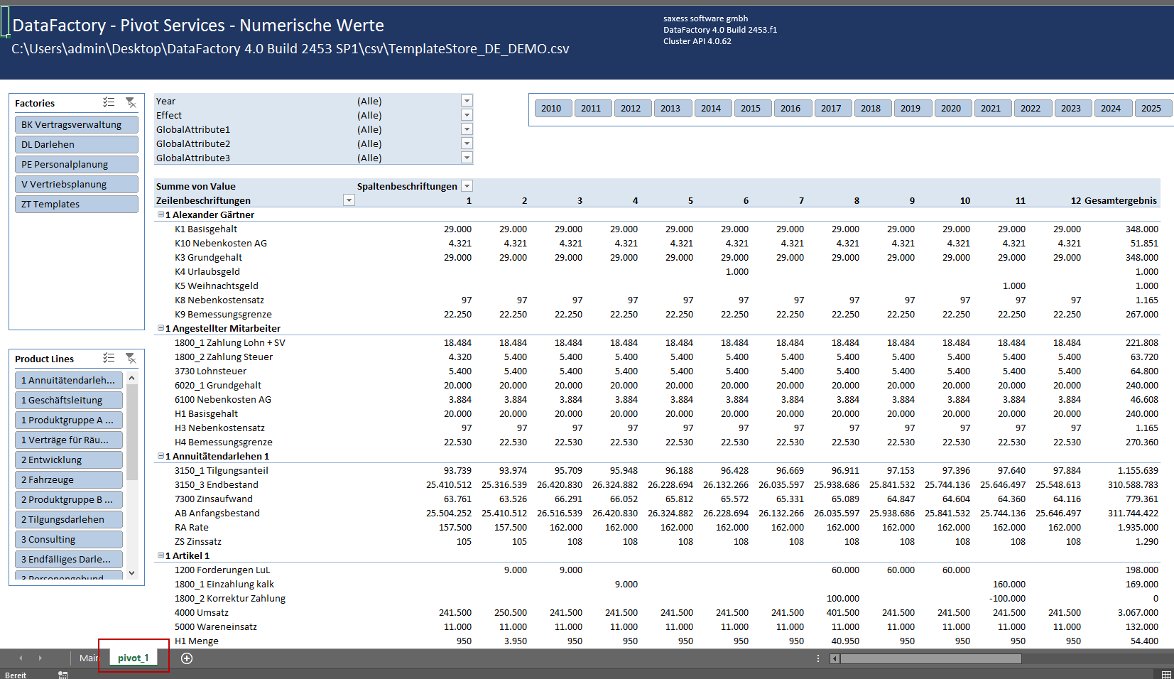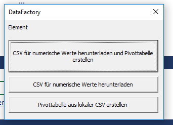 Download CSV for numeric values and download pivot table | A .csv file will be downloaded and saved in the DataFactory folder "csv". A new spreadsheet containing the pivot table will be created in your Excel folder. |