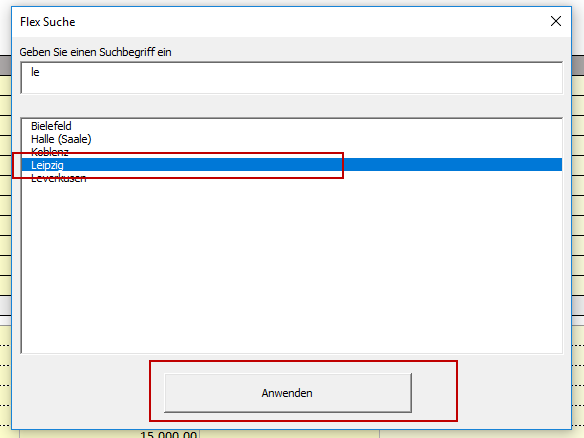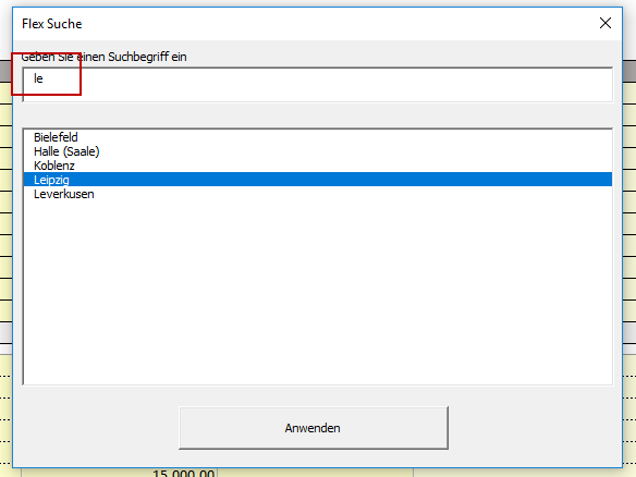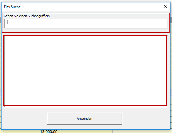 2) The FlexSearch window will open, in which you will find a line for your search entry and a scrollable suggestions list to choose from.