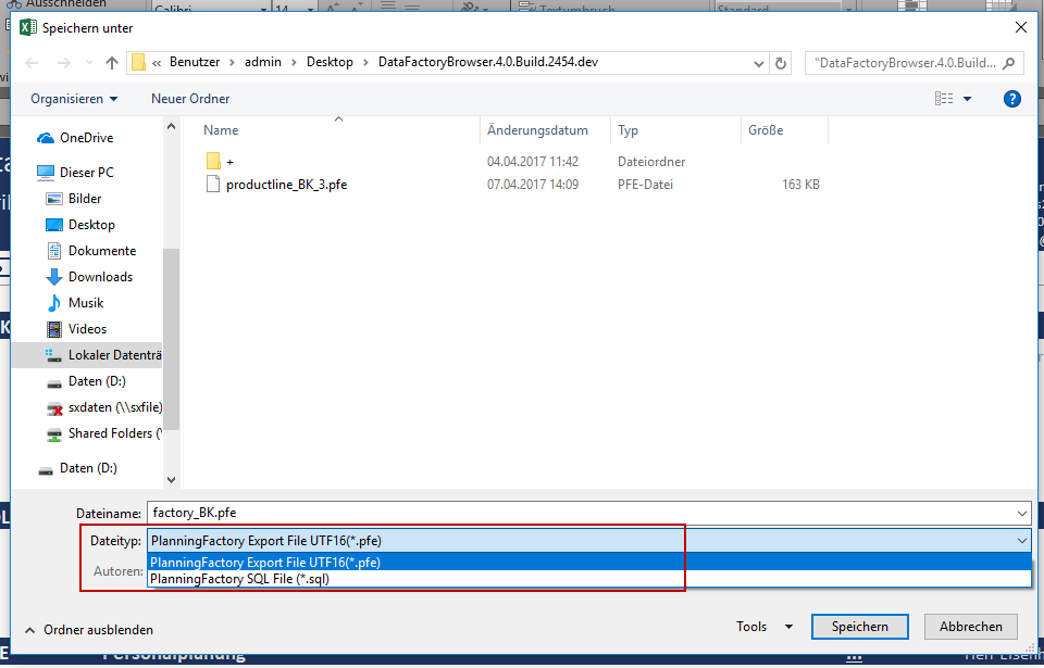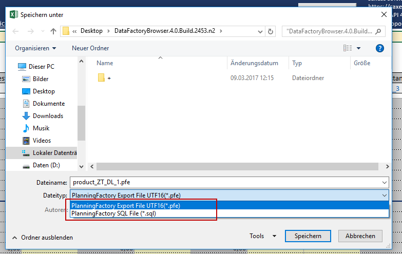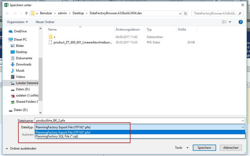 3) A window will open in which you can choose where and with what name the product will be saved. Furthermore, you are required to select whether you want to save the product as a .pfe or .sql-file.