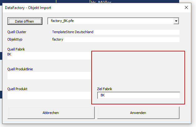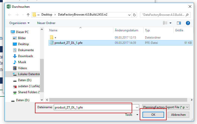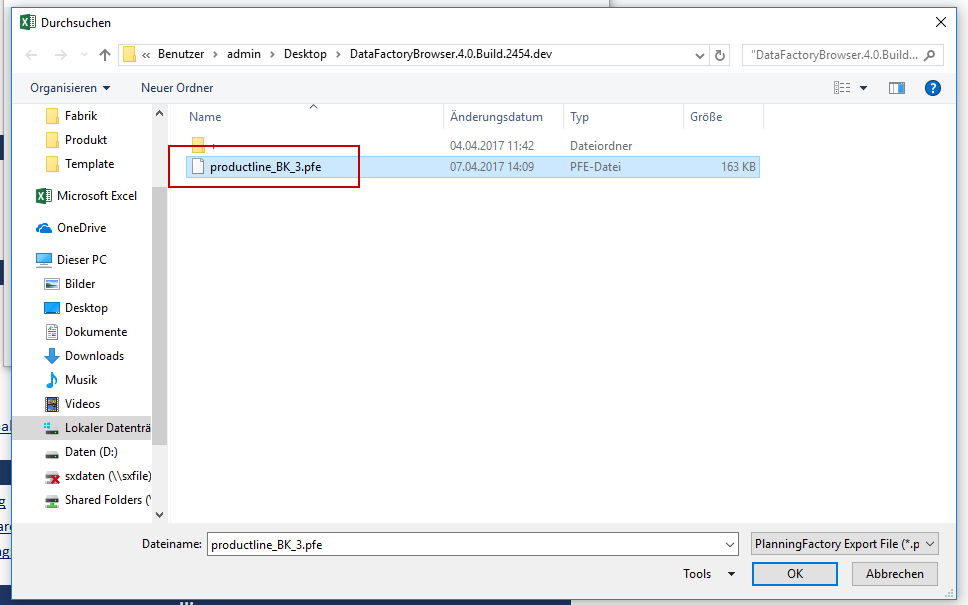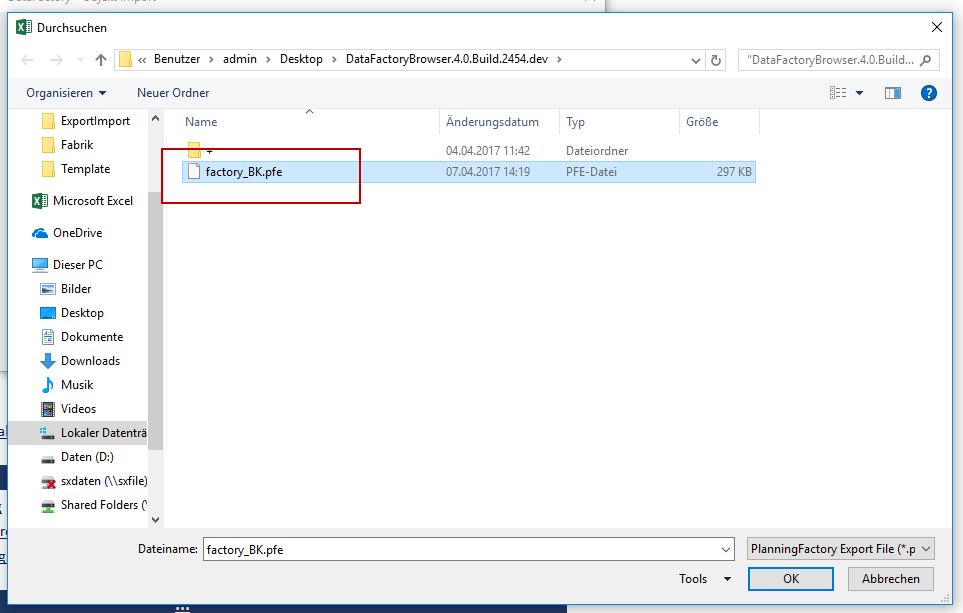 4) Select the factory (.pfe-file) you wish to import and click on OK.