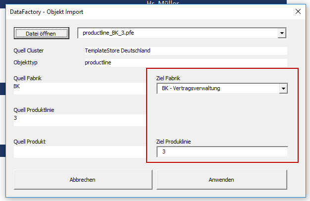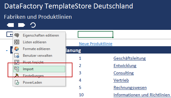 Templates and products, as well as entire factories and product lines, can be imported and exported in the Excel client.