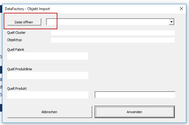 3) A window for the import function will open. Click on Open File to choose the factory you wish to import.