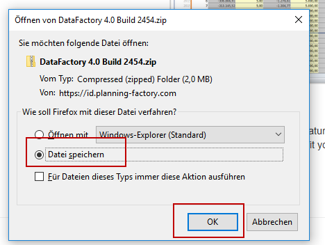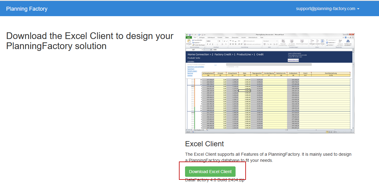 The current release of the Excel client can be found at https://planning-factory.com. Download the new Excel client file and install it as described in the chapter Updates.
