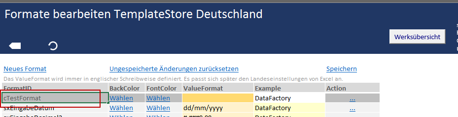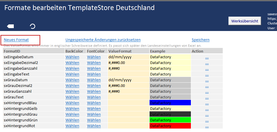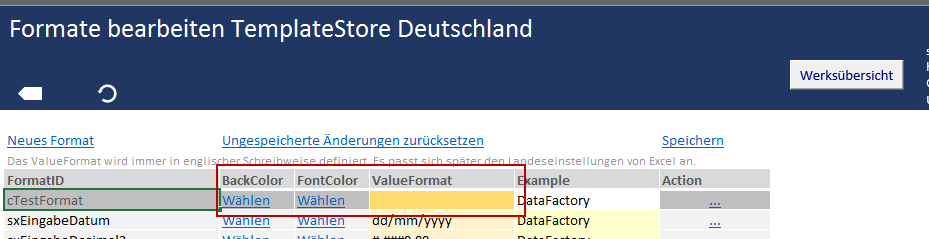 5) In the column BackColor, select, if applicable, a background color or font color. In the ValueFormat column, select a display format (if applicable).