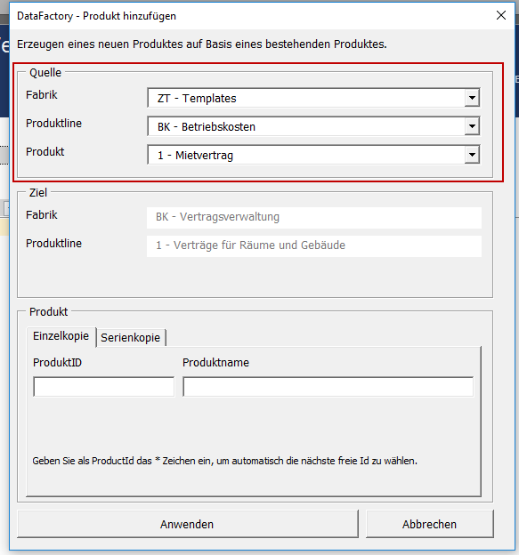 3) Choose a source template by selecting the corresponding factory, product line and product.