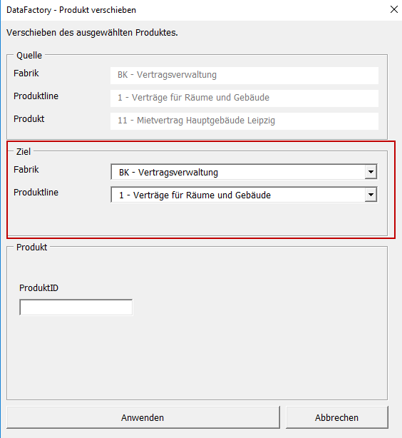 3) Choose the destination by selecting the Destination Factory and Destination Product Line.