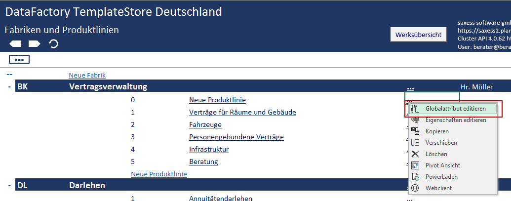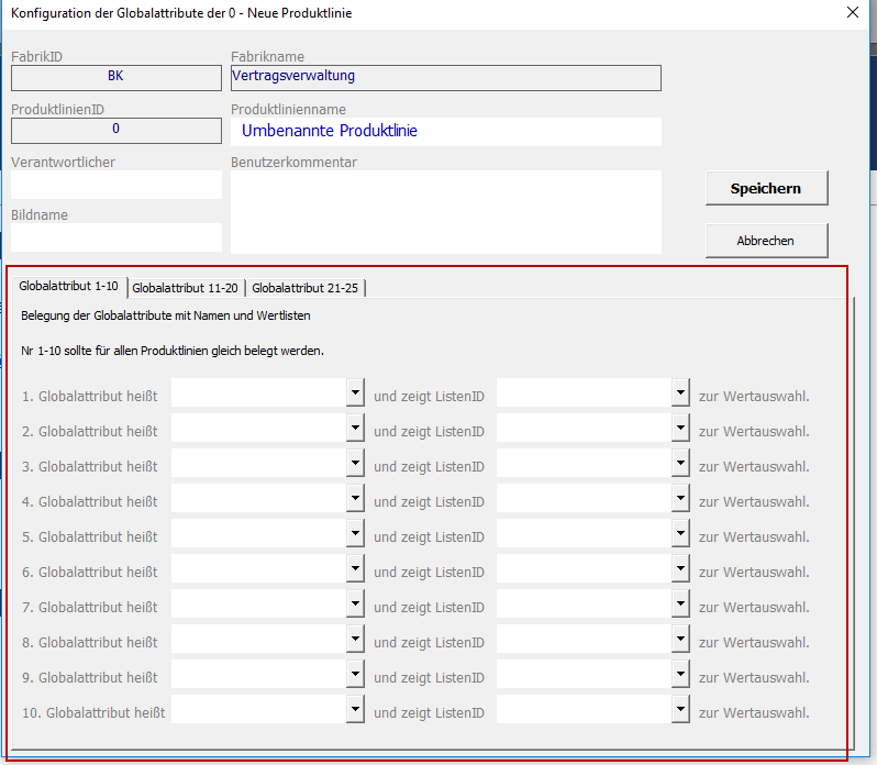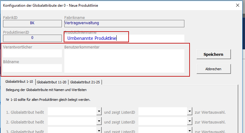 Each product possesses the global attributes Responsibility, Image Name, and User Comments. It is possible to configure up to 25 further global attributes for each product line. These can serve as hierarchical and structural levels in later evaluation processes.