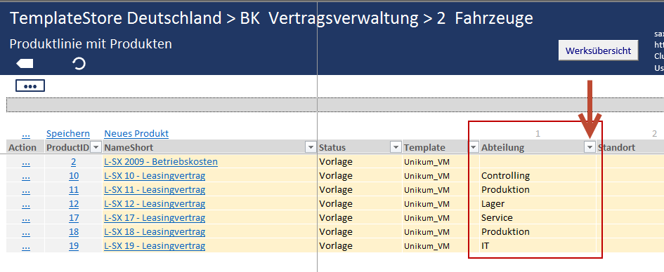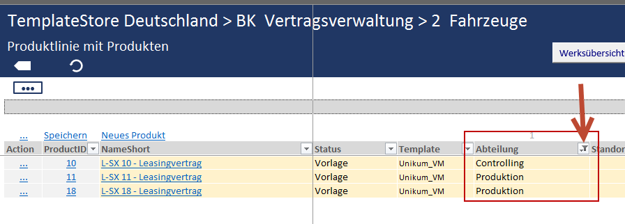 Note: You can also use the filter function in the default columns ProductID, NameShort, Status and Template as explained above.