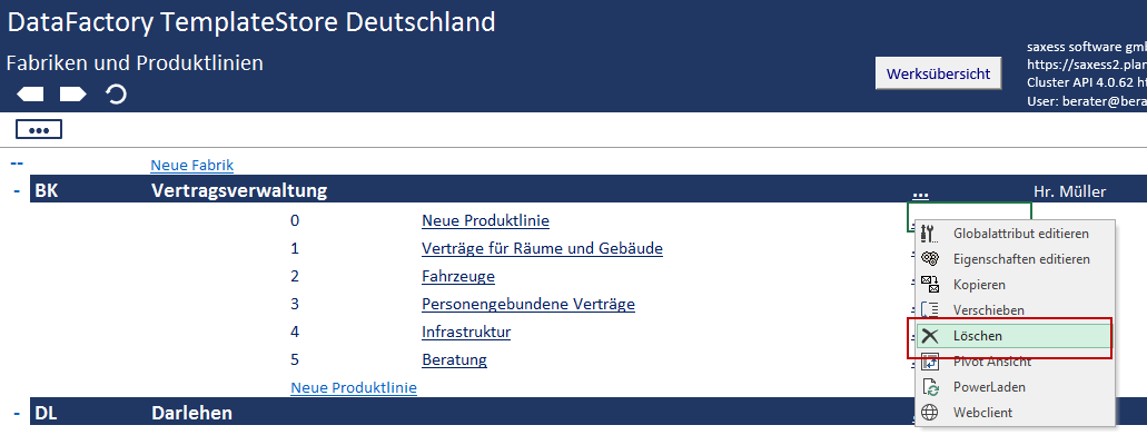 1) Navigate to the product line you wish to delete and click on the ActionLink.