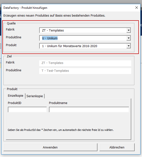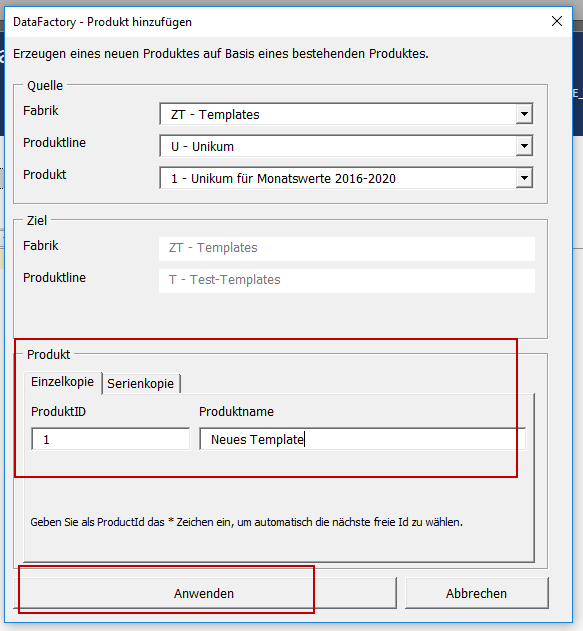 4) Enter a ProductID and a ProductName for your new template and click on Apply to create your new template.