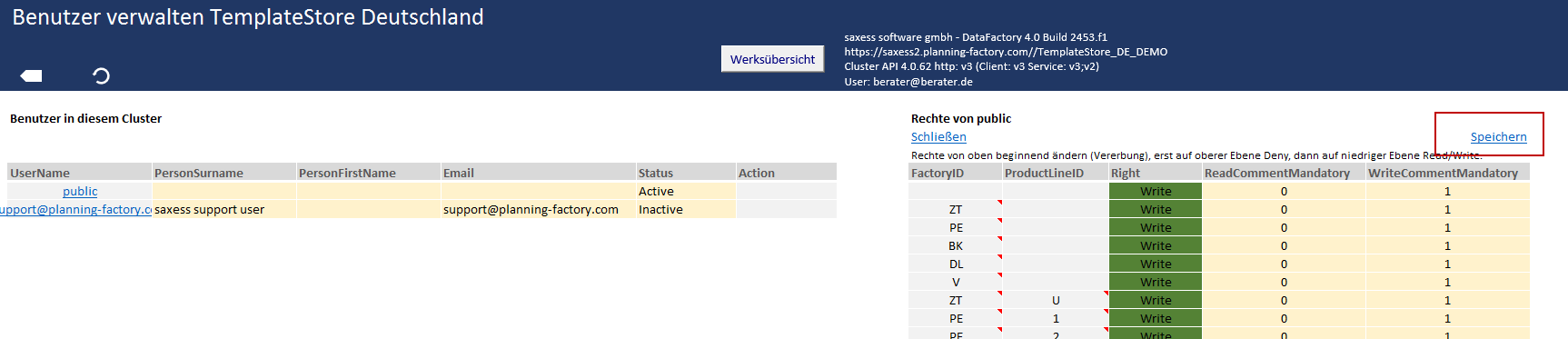 Note: Rights in DataFactory will be carried forward. If you wish to grant a user the same rights and required comment settings for the entire work, it is only necessary to edit these properties in the first line. After saving, these settings will be applied to all lines. Access rights to a factory can be edited in the same manner if the user is to have access to all product lines of a factory. To deny all users access rights, execute a Deny in the top level.