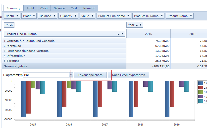 If you have defined a layout for your pivot table and your pivot chart to present your data, you can now save the layout by clicking on the Save Layout button. If you exit the factory or work and reopen it later, the new layout will remain.
