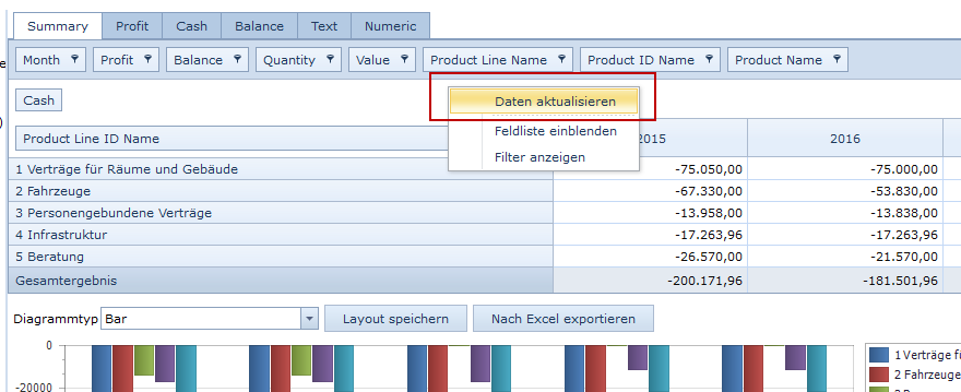 If you enter a factory and show the pivot table, the current data will always be loaded from the database into the pivot table. If data in DataFactory is updated while you are still in the pivot view, these updates will not immediately be shown in your pivot. In this case, the data must be manually updated.