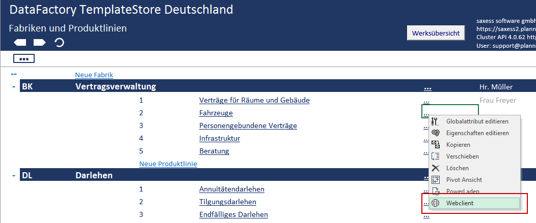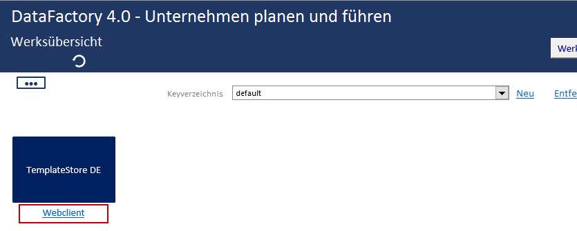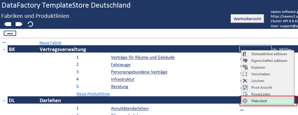 If you use DataFactory in the Cloud version, meaning that your database is located on a Cloud server, the Web Client option will be displayed below your cluster in the work overview. By clicking the Web Client option, your default web browser will open and you will be navigated to the web view of your work.