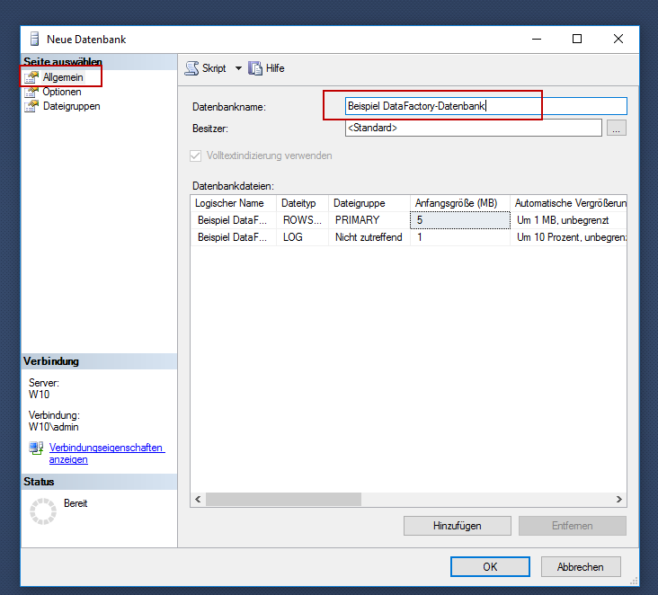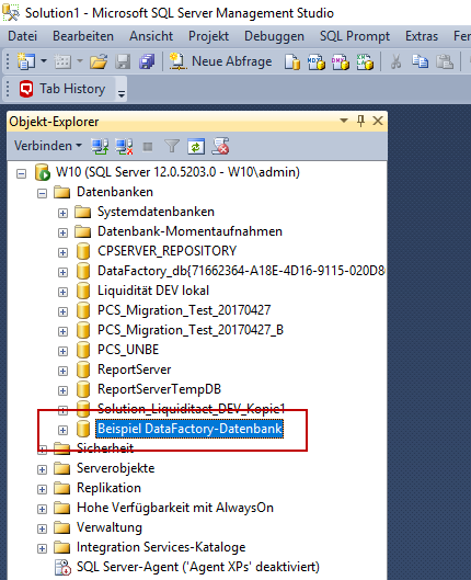 To enable the DataFactory database to connect to your Excel client or the web client, it will first need to be set up on your SQL server. This means that a database must be created on the SQL server via the SQL Management Studio. A script will then be executed on this database which creates all DataFactory-specific tables, views and procedures (API). Proceed as follows: