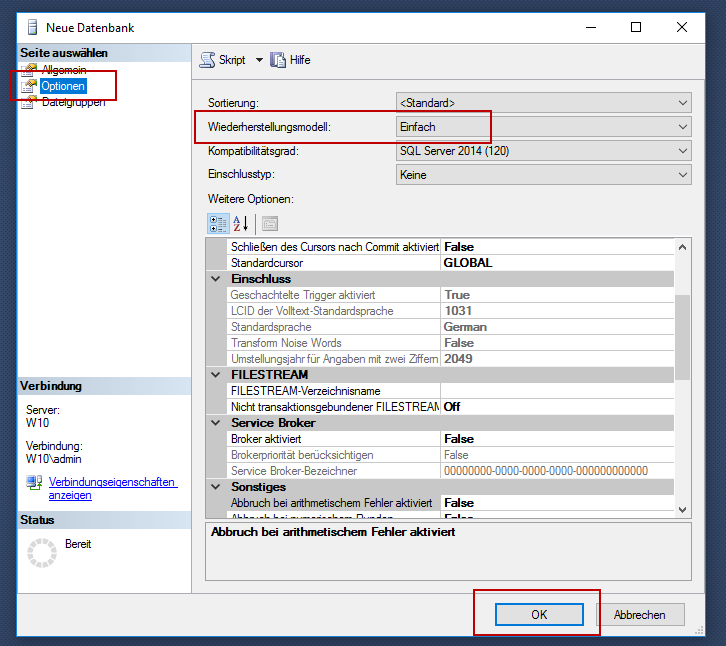3) In the Options tab, make sure that your recovery model is set to Basic and click OK to confirm.