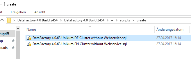 5) Open the + folder in your DataFactory folder and select the Scripts folder, followed by the Create folder. Here you will find two scripts which will create a DataFactory database from your database. Click on your chosen script to open it.