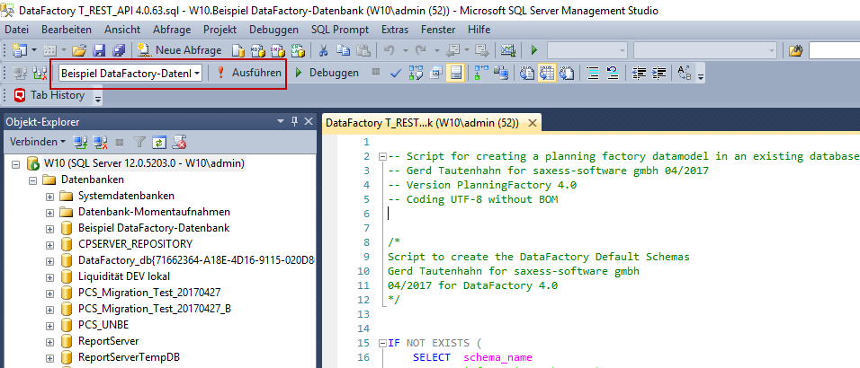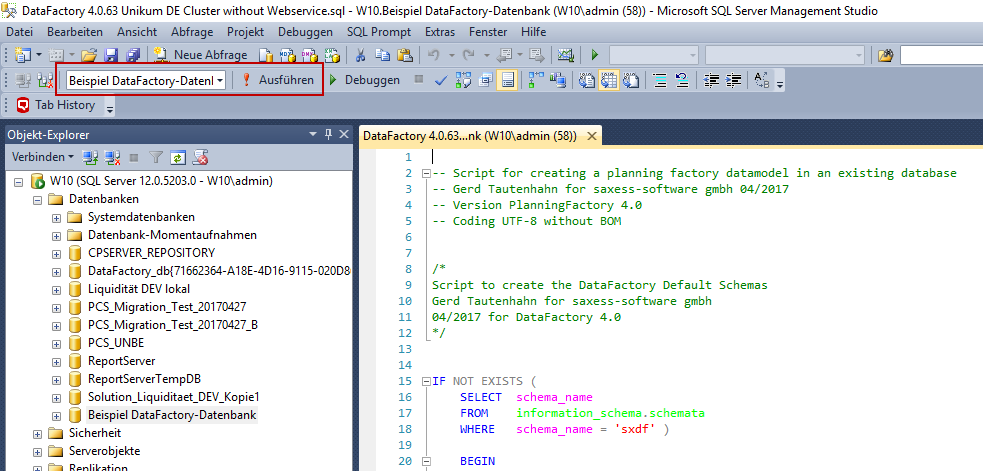 2) Your SQL Management Studio will open. Execute the script on your DataFactory database by selecting the database in the drop-down menu and clicking on Execute.