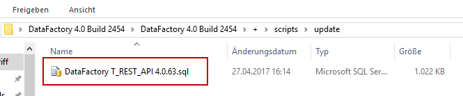 1) Open the + folder in your DataFactory folder, followed by the Scripts folder. Select the Update folder. Open the SQL file to update the API.